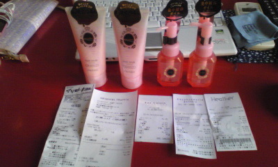 たくさん買ったけどこれでも3万ちょいです。あとしばらくは買わないので。マシェリのヘアケア用品を2点ずつ買ったのは、マツキヨで2点買うとかなりお得だったのでまとめ買いしました。(´∀`*)ウフフ