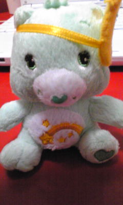 このケアベアは【ウィッシュベア】という名前で、「願いごとを叶えるお手伝いをしてくれる女のコ。恥ずかしがりやで、おとなしい性格。」とケアベア辞典